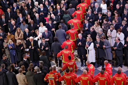 The cathedral’s bells rang out and the Archbishop of Paris, Laurent Ulrich, struck the doors of Notre-Dame three times with his crozier before symbolically reopening the building, as the ceremony started. First responders who helped preserve the Gothic masterpiece and some of those who subsequently restored it received a standing ovation.