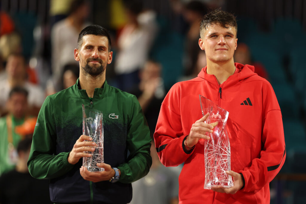 Le Serbe Novak Djokovic, âgé de 37 ans, a été privé d’un 100e titre par le jeune tchèque Jakub Mensik, 19 ans, vainqueur 7-6 (7/4), 7-6 (7/4) en finale du Masters 1000 de Miami (Floride, Etats-Unis) dimanche.Le destin est parfois coquin. A l’issue d’une finale des extrêmes entre deux joueurs de 18 ans d’écart d’âge, c’est le jeune loup Mensik, en quête d’un premier succès, qui a dominé la légende Djokovic, son idole, qui visait lui son 100e titre.Après un début de partie retardé de près de six heures à cause de la pluie, Mensik, 54e joueur mondial, a surfé sur la confiance d’un tournoi formidable, où il aura gagné les sept tie-breaks qu’il a eu à disputer.Impérial au service (14 aces) et solide dans les moments chauds, Mensik a su, malgré son inexpérience, maîtriser un match serré et au niveau de jeu très élevé face au grand maître serbe aux 24 titres en Grand Chelem.”Si je suis là c’est grâce à toi. J’ai commencé le tennis grâce à toi. J’ai pu m’entraîner avec toi. Il n’y a pas de meilleur chose que te jouer en finale d’un tournoi. Merci pour tout ce que tu as fait pour notre sport, tu es une personne incroyable”, a déclaré Mensik lors d’une cérémonie des trophées en forme de passation de pouvoir.”Ca me fait mal de l’admettre, mais tu as été meilleur dans les moments importants, notamment au service dans les moments chauds, a souri Djokovic. Pour un jeune joueur comme toi c’est un grande qualité, je suis sûr que tu l’utiliseras souvent dans le futur.””C’est le premier d’une longue série”, a promis Djokovic à son jeune adversaire, devenu le premier Tchèque victorieux en Masters 1000 depuis Tomas Berdych en 2005 à Paris.- Le plaisir de Djokovic -Grand espoir du tennis, Mensik n’était pas né lorsque Djokovic jouait ses premiers matchs en Grand Chelem en 2005, un fait qui, lorsqu’on le lui a fait remarquer en conférence d’après-match, l’a conduit à se prendre la tête entre les mains.”Et il est toujours dans le top 5. C’est tout simplement fou et incroyable ce qu’il accomplit dans ce sport sur une longue période”, a-t-il salué. “Imaginez-moi dans 20 ans, quand j’aurai 39 ans, est-ce que je jouerai des finales ? Je l’espère, mais c’est fou d’y penser comme ça”.Près de deux décennies après sa première rencontre en Masters 1000, le Serbe reste en quête d’un 100e titre, une barrière seulement franchie jusque là chez les hommes par Roger Federer (103) et Jimmy Connors (109).Djokovic, forfait en demi-finale de l’Open d’Australie en janvier et champion olympique l’été dernier à Paris, a prouvé qu’il pouvait toujours tutoyer les sommets, lors du tournoi floridien où il a “connu le plus de plaisir depuis des années”.Avec un oeil droit gonflé sur lequel il a appliqué régulièrement des gouttes, Djokovic a rapidement perdu son service dans la première manche (2-0 Mensik).Mais le Serbe, qui a fait admirer sa qualité de retour malgré la propreté de l’engagement adverse, a débreaké à sa première occasion (3-4) avant d’emmener Mensik au tie-break.Le Tchèque a alors été royal, notamment au filet, pour rapidement mener 5-0 puis plier la manche à 7-4.Djokovic, qui a ensuite sauvé deux balles de break à 2-2 dans la deuxième manche, a demandé l’appui de la foule après des points superbes, est tombé plusieurs fois à terre, avant de chuter pour de bon dans un nouveau tie-break où il s’est rendu coupable de plusieurs fautes.Mensik a révélé avoir failli déclarer forfait, touché à un genou, avant son match du premier tour contre l’Espagnol Roberto Bautista, mais “un miracle” réalisé par l’un des kinés du tournoi floridien, couplé à une pause déjeuner plus longue que d’habitude de l’arbitre de ce match lui a permis de s’aligner et de s’imposer en trois sets.Il sera 24e mondial lundi, de loin son meilleur classement, alors que Djokovic va rester à la 5e place, mais repartir confiant en quête d’un 100e tournoi.