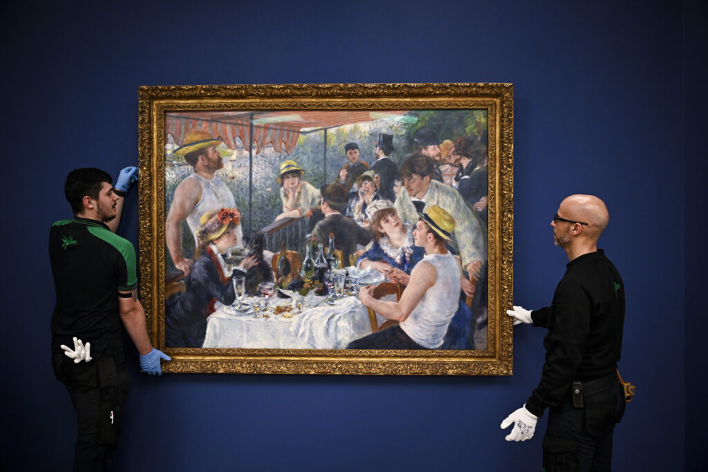 “Le Déjeuner des canotiers”, chef-d’oeuvre de Renoir appartenant à une collection américaine et rarement prêté, a été accroché lundi au musée d’Orsay à Paris, prélude à une double exposition autour du peintre impressionniste dès le 17 mars, a constaté l’AFP.Peint entre 1880 et 1881, ce grand format de 130 cm par 175 cm représente une fin de déjeuner estival à la Maison Fournaise à Chatou, sur les bords de Seine, un des lieux fétiches d’Auguste Renoir (1841-1919).Installés au balcon, la quinzaine de convives badinent, se rapprochent voire se séduisent, laissant filer le temps. Acheté par le marchand Paul Durand-Ruel, le tableau a été acquis dans les années 1920 par le collectionneur américain Duncan Phillips et conservé dans sa Phillips Collection, musée d’art moderne réputé à Washington.”Le Déjeuner des canotiers” n’a pas fait escale à Paris depuis 20 ans, lors d’une exposition au musée du Luxembourg. Le revoir en France, “c’est un très grand événement.
